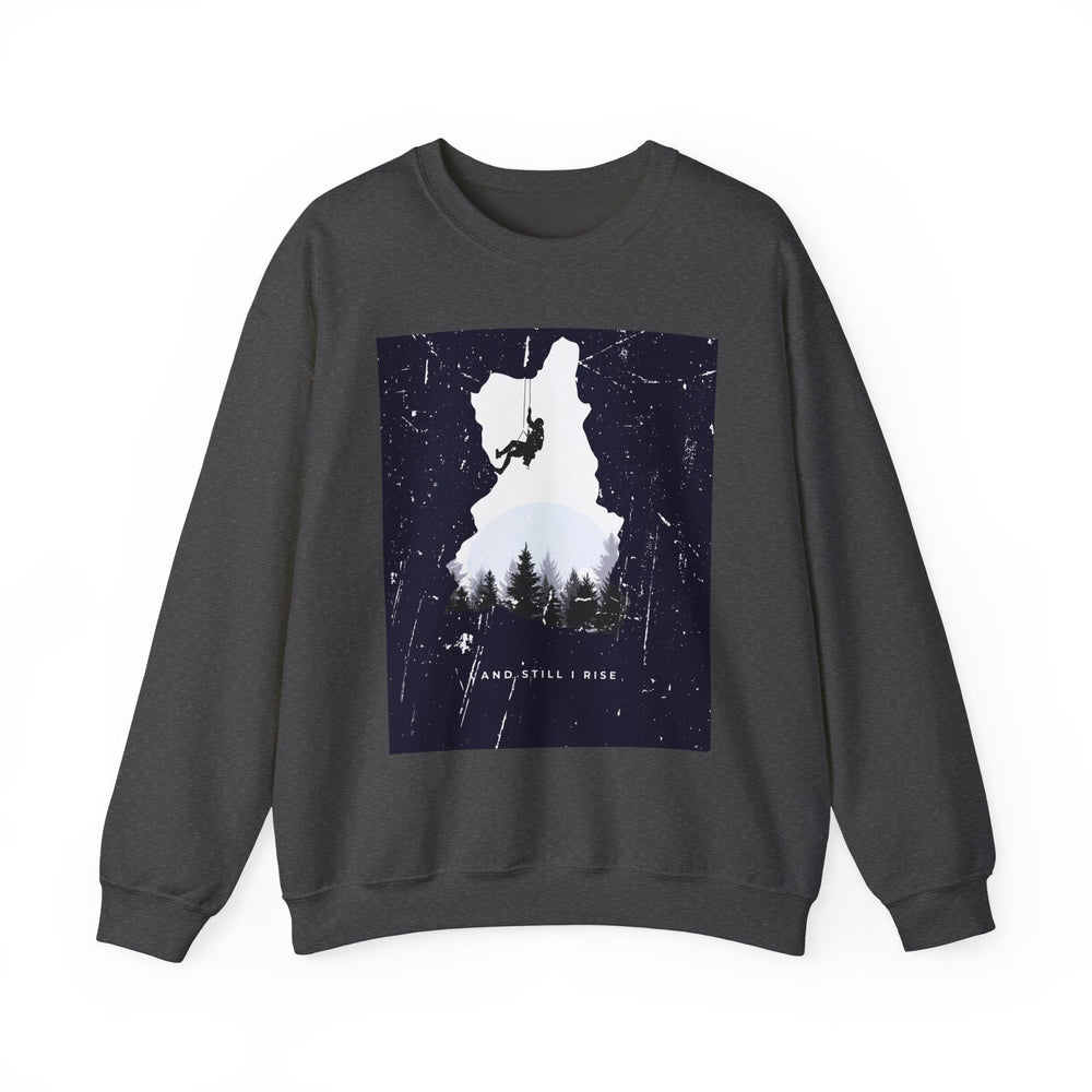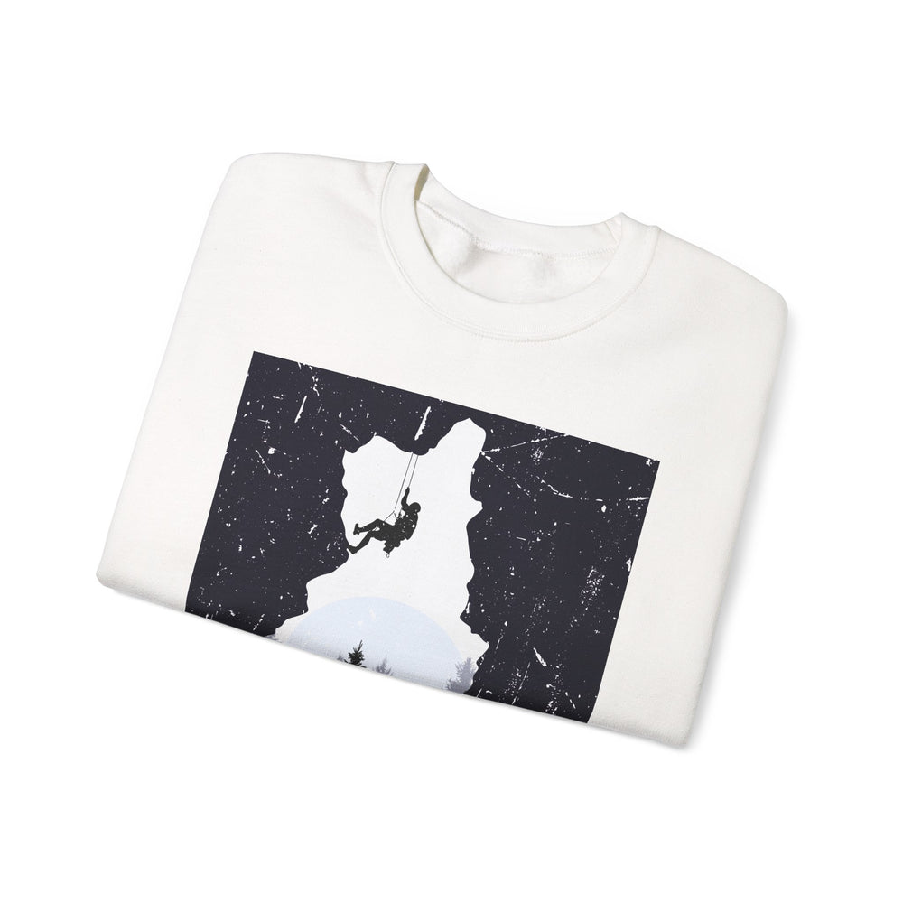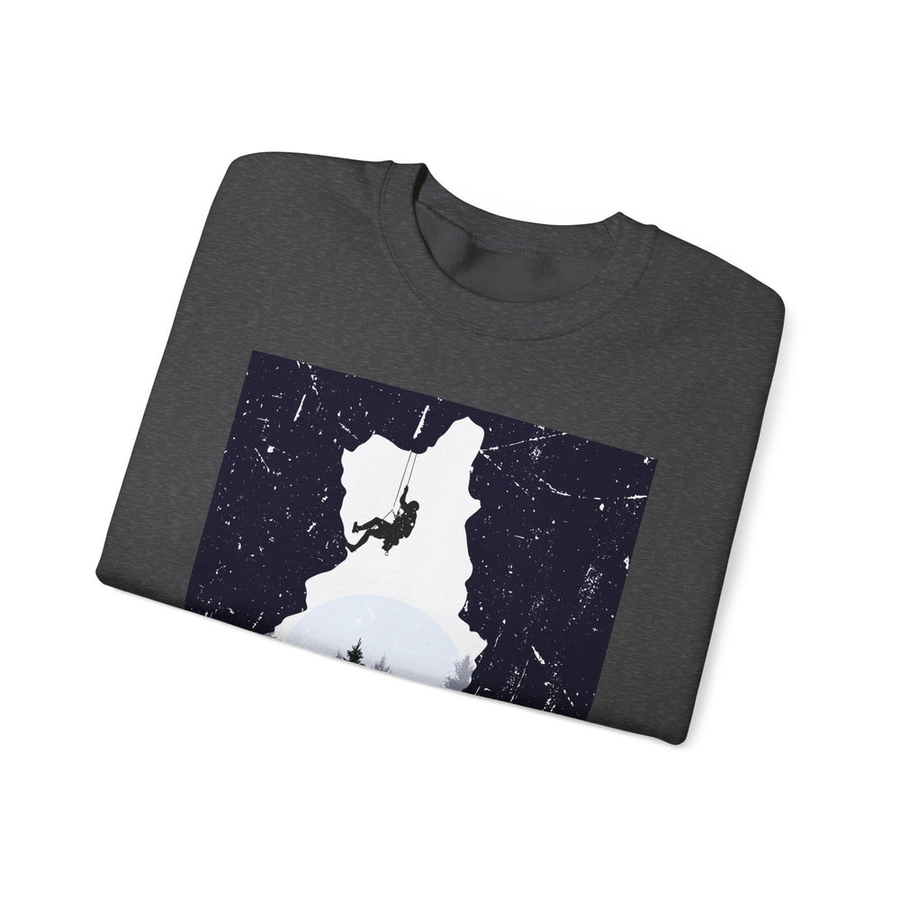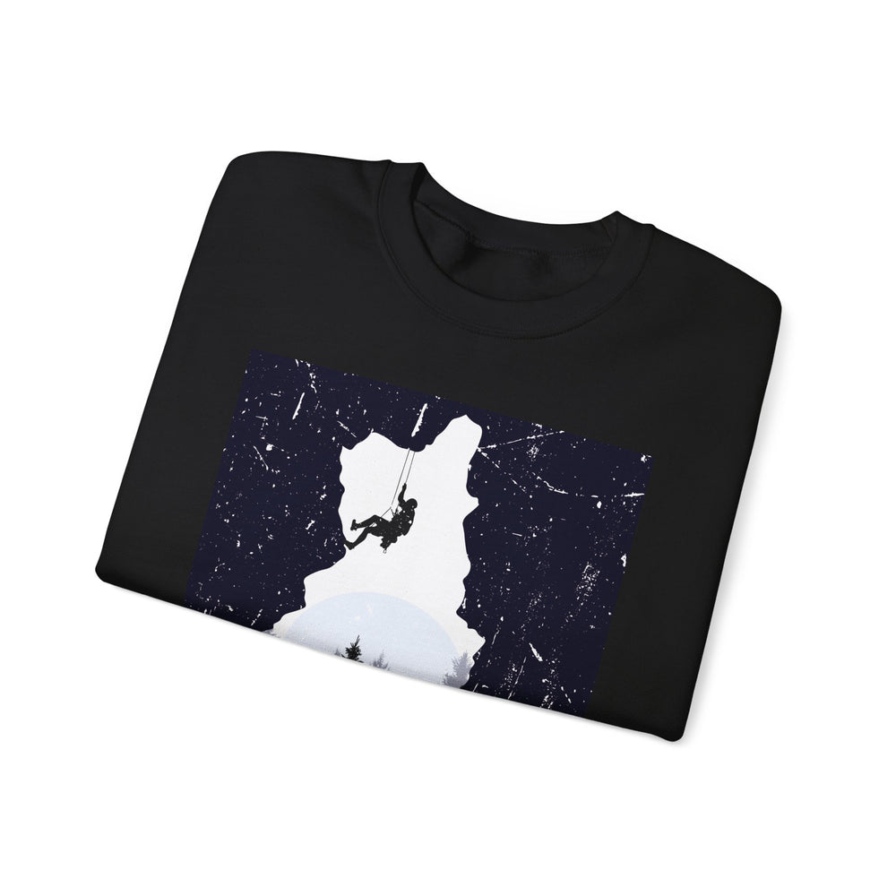 A soft, midweight crewneck that feels like an evening around a forest campfire. The front print layers a climbing silhouette over a moonlit pine grove — a quiet, outdoorsy scene that reads like a memory you can wear. The sweatshirt’s classic fit and clean crew neckline make it easy to toss on after a hike, at the crag, or on slow weekend mornings. Subtle distressed texture in the print gives it lived-in character, while sturdy double-needle stitching keeps it dependable through seasons of use. Wear it when you want something warm, honest, and grounded in the shape of the woods and the pull of the rock face.