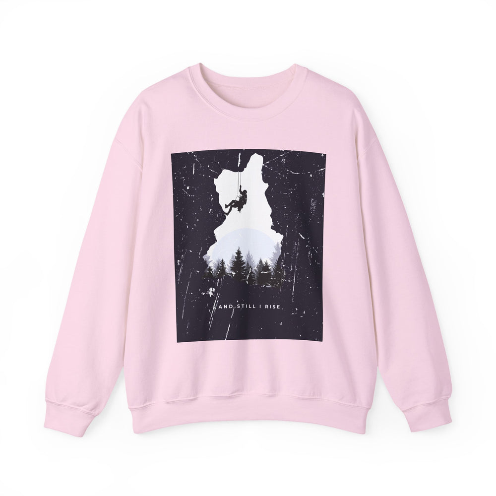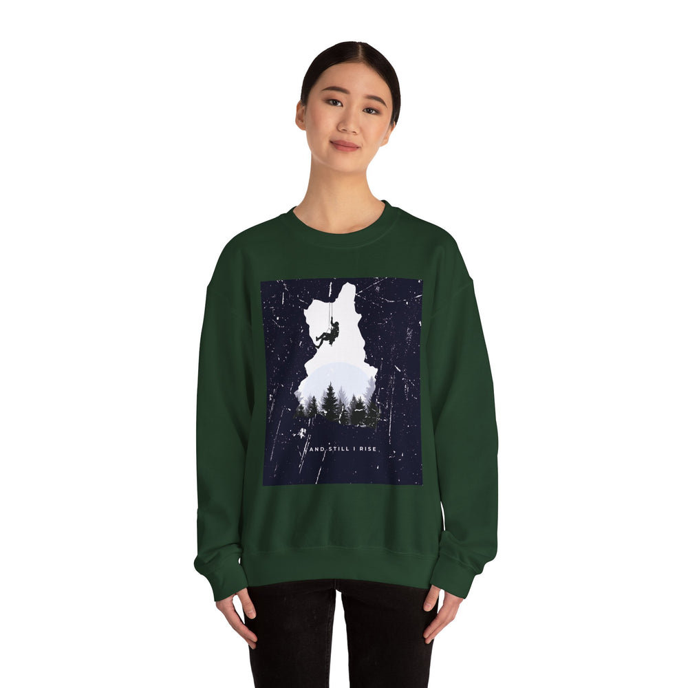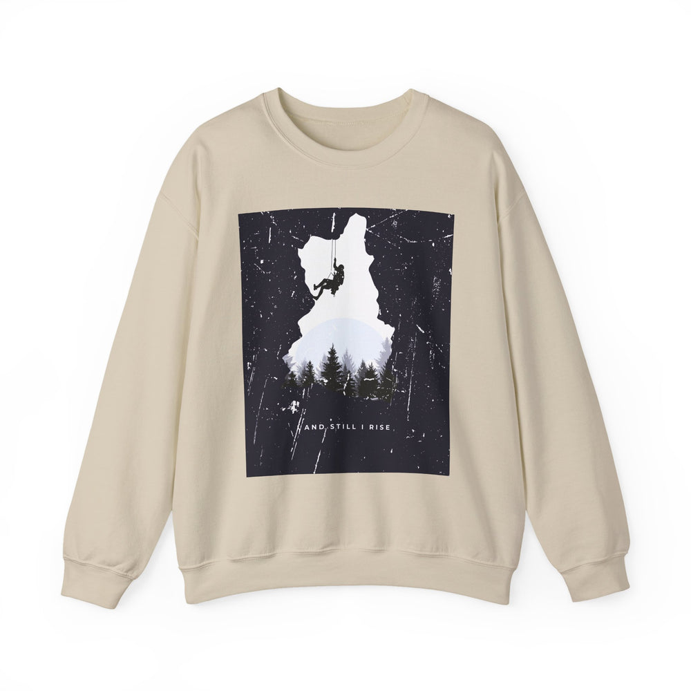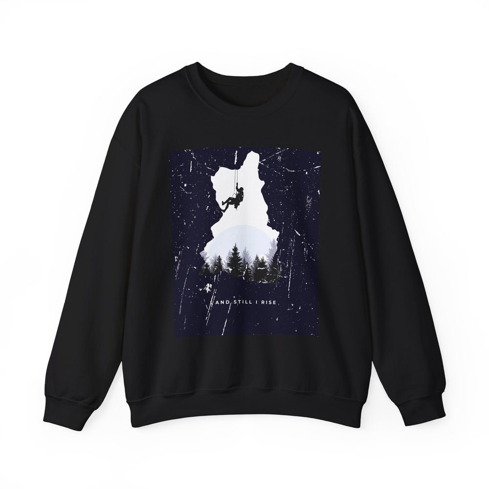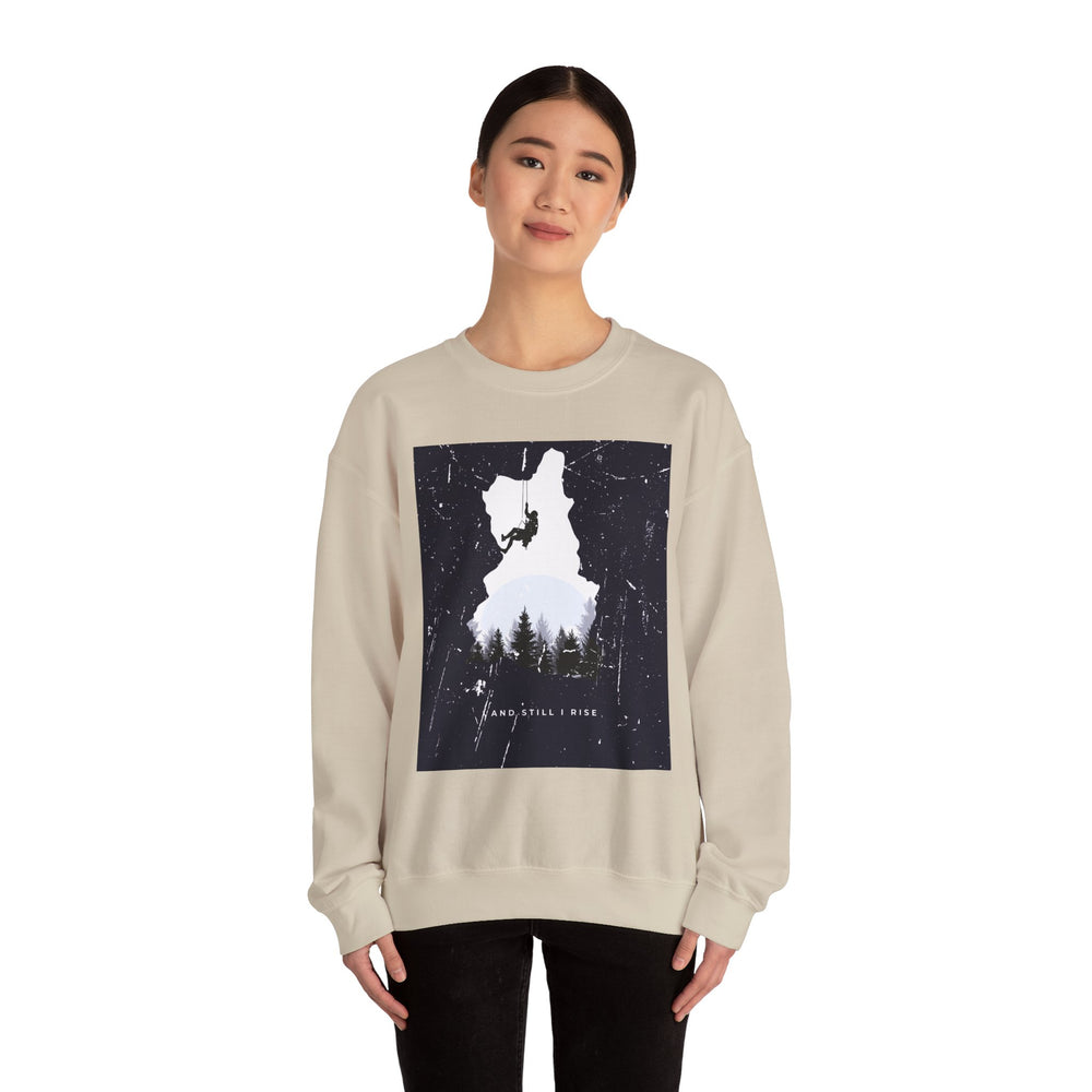 A soft, midweight crewneck that feels like an evening around a forest campfire. The front print layers a climbing silhouette over a moonlit pine grove — a quiet, outdoorsy scene that reads like a memory you can wear. The sweatshirt’s classic fit and clean crew neckline make it easy to toss on after a hike, at the crag, or on slow weekend mornings. Subtle distressed texture in the print gives it lived-in character, while sturdy double-needle stitching keeps it dependable through seasons of use. Wear it when you want something warm, honest, and grounded in the shape of the woods and the pull of the rock face.