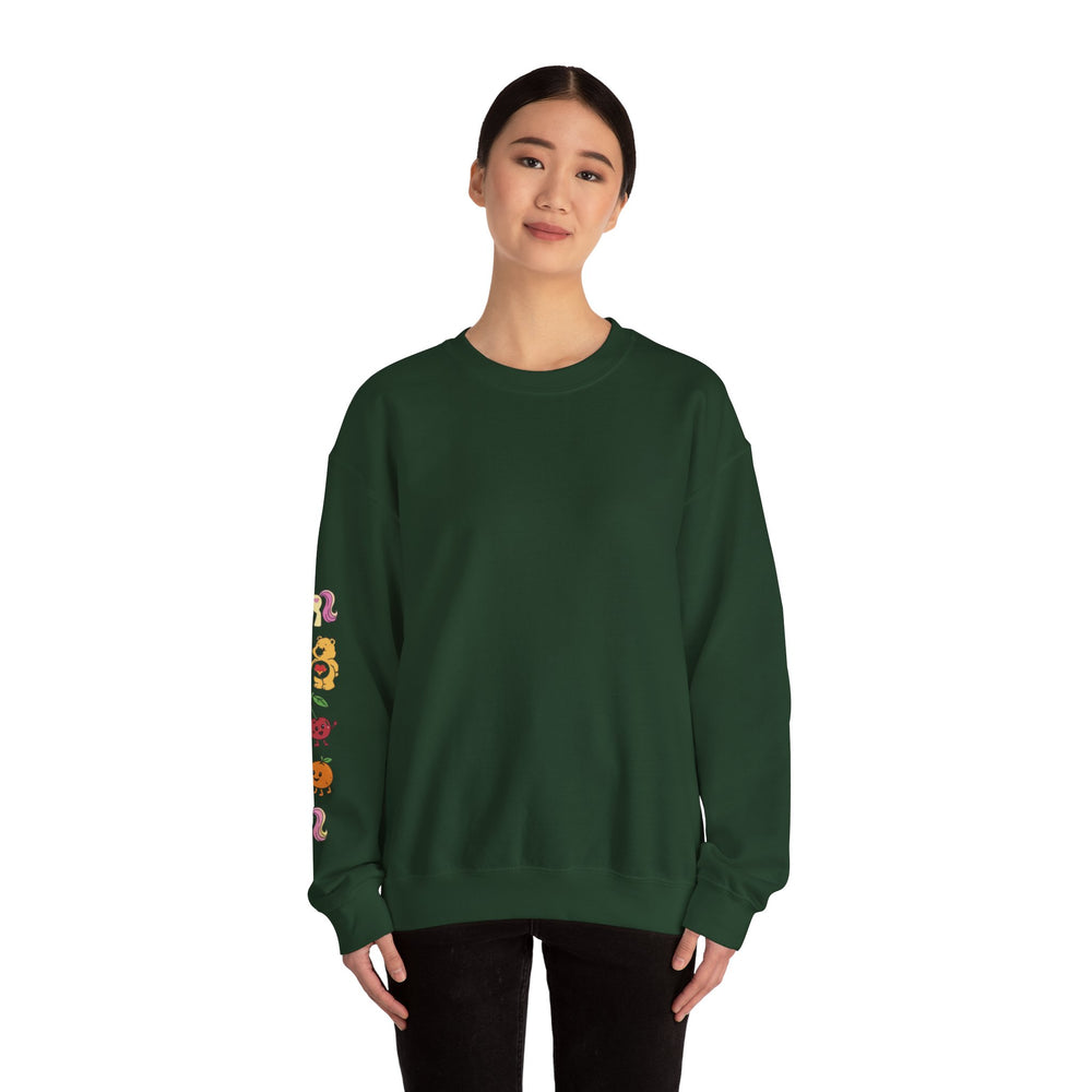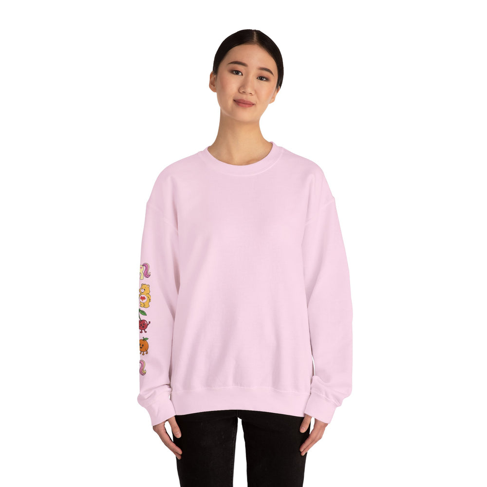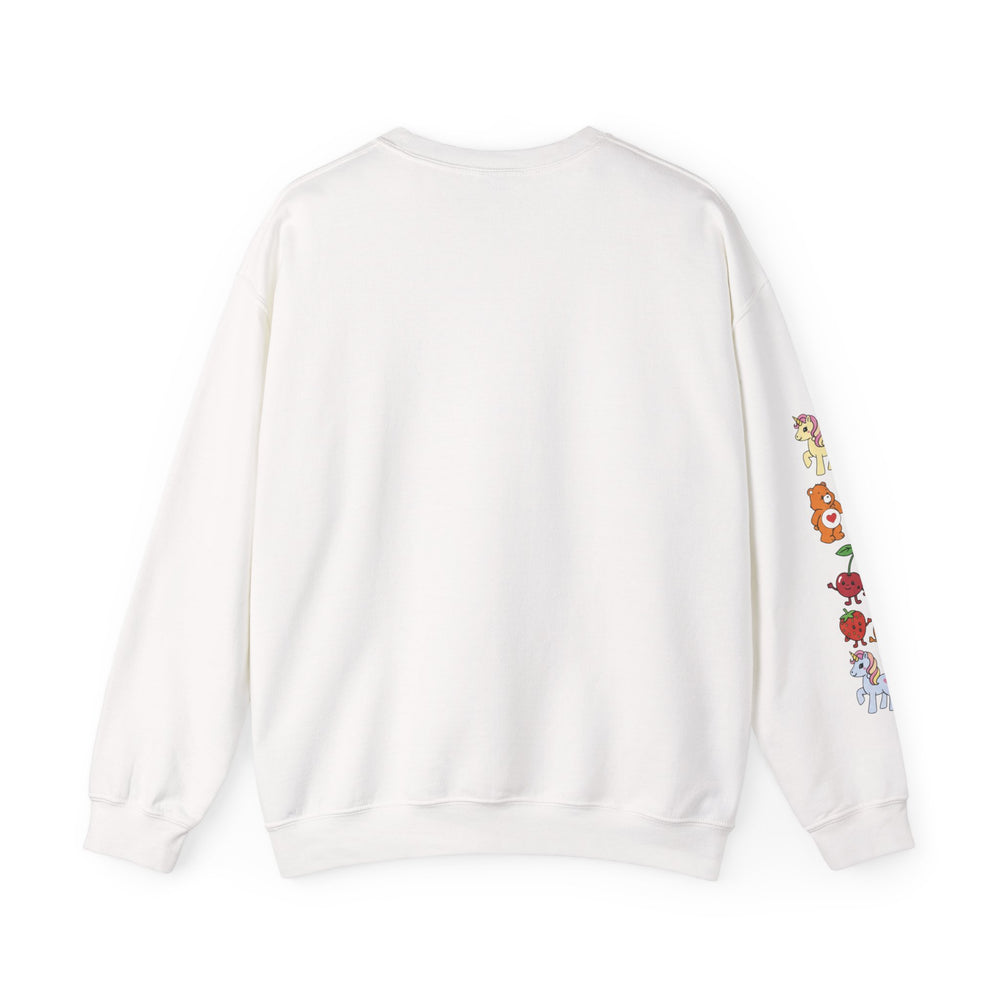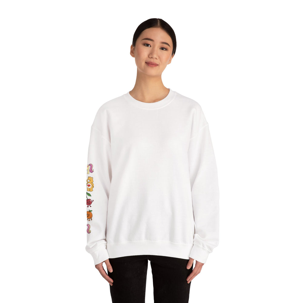 This cozy crewneck brings soft, lived-in comfort with a playful, hand-drawn vibe down the sleeve. Built from a medium-heavy 50/50 cotton–poly blend, the sweatshirt holds its shape while feeling warm and breathable. The clean, classic cut and ribbed collar make it easy to layer over tees or under jackets. Small, colorful mascot-style illustrations run along one sleeve, adding a subtle, joyful detail that reads casual and personal rather than loud. Durable double-needle stitching and thoughtful finishing — tear-away neck label and OEKO-TEX certified dyes — mean this piece wears well and stays comfortable wash after wash. Let it be the easy piece you reach for on slow weekends, evening walks, or when you want something soft with a touch of whimsy.