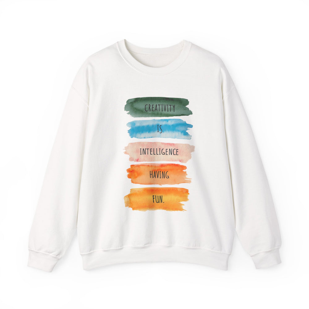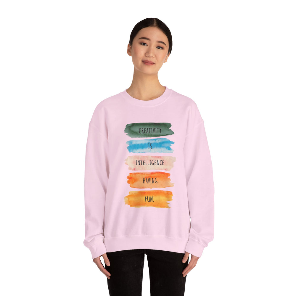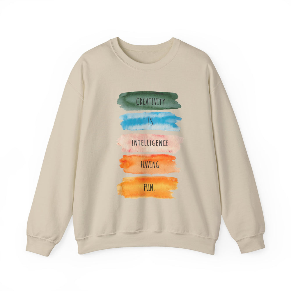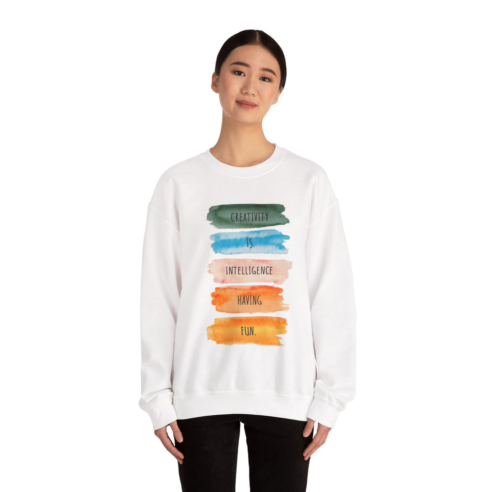 Soft, roomy, and quietly expressive — this crewneck carries a playful watercolor statement down the front: stacked brushstrokes in green, teal, peach, orange and gold with the words “Creativity is intelligence having fun.” It feels like a studio hug after a long day: warm midweight fleece, a clean crew neckline, and durable double-needle stitching that stands up to repeated wears and washes. The tear-away label keeps the neck itch-free while the tubular knit body gives a smooth, seam-free side profile. Wear it to sketch nights, coffee dates, gallery visits, or as your go-to layer when inspiration strikes. The vibe is casual, creative, and confidently comfortable — for anyone who likes their clothes to say something kind and clever without shouting.