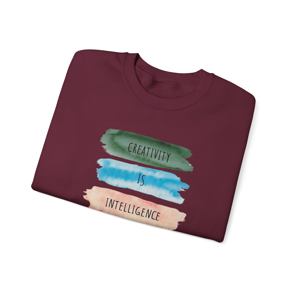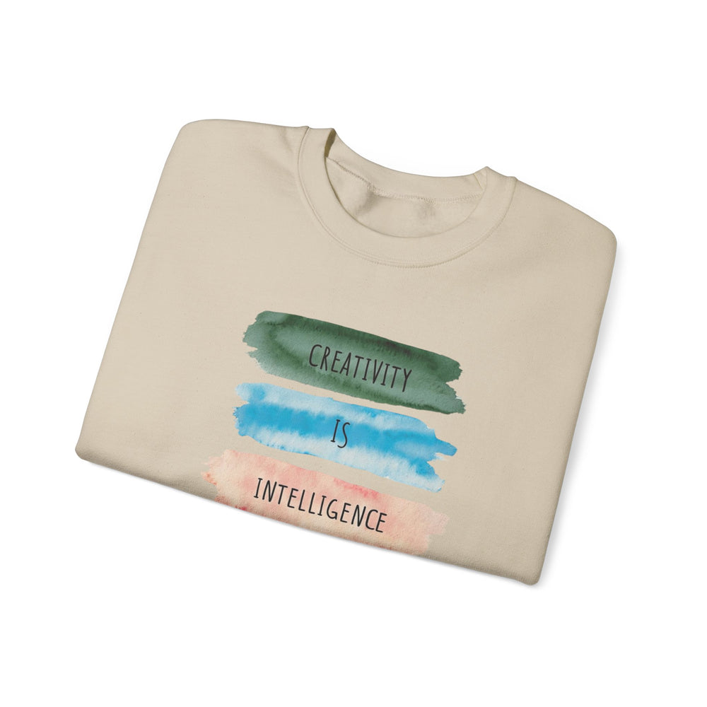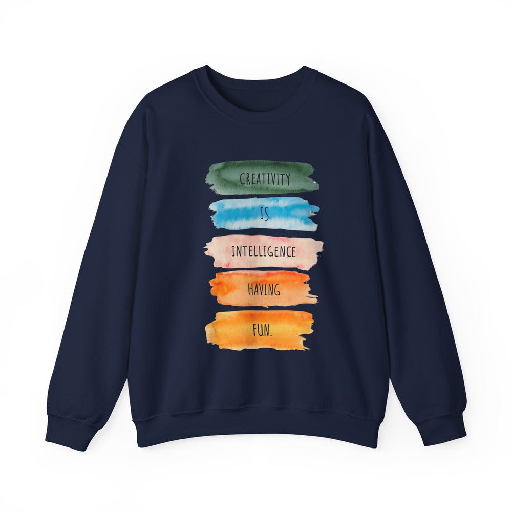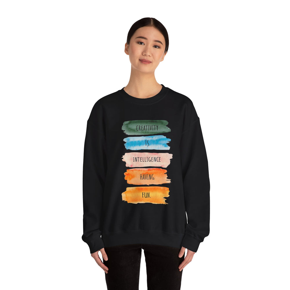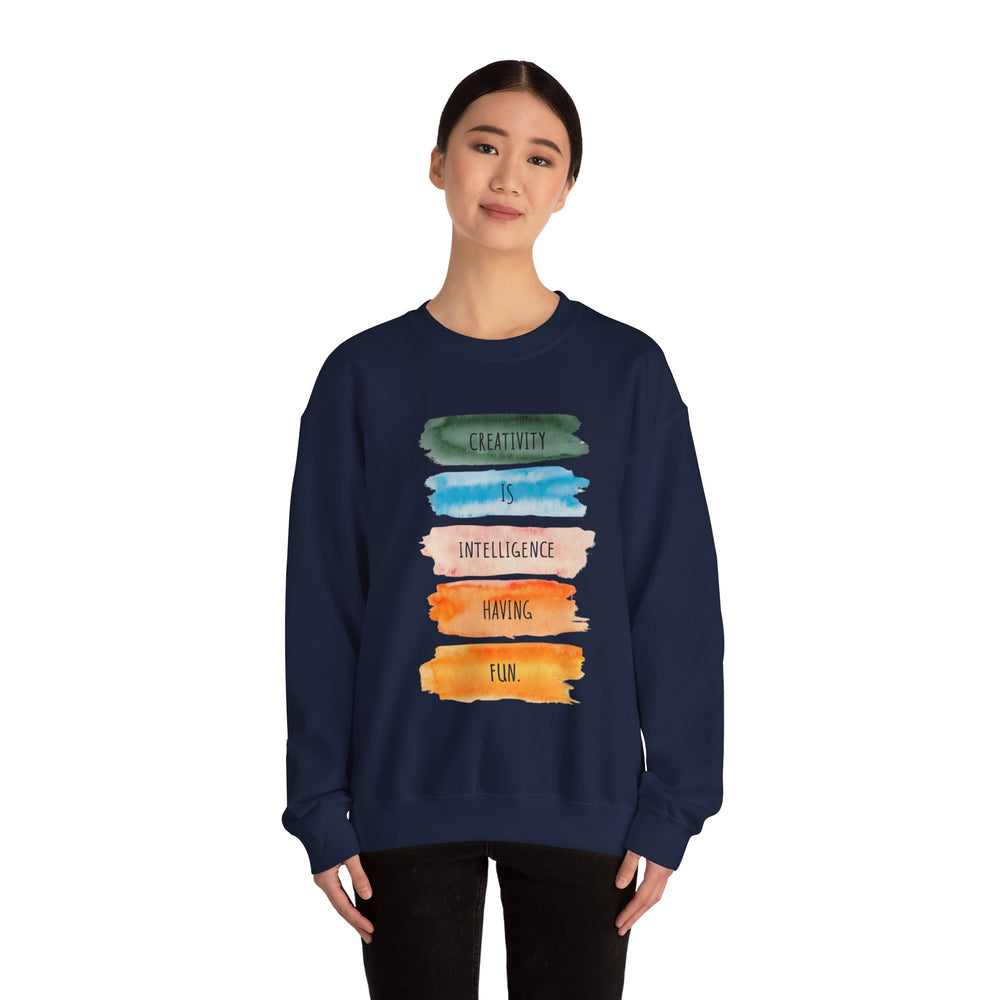 Soft, roomy, and quietly expressive — this crewneck carries a playful watercolor statement down the front: stacked brushstrokes in green, teal, peach, orange and gold with the words “Creativity is intelligence having fun.” It feels like a studio hug after a long day: warm midweight fleece, a clean crew neckline, and durable double-needle stitching that stands up to repeated wears and washes. The tear-away label keeps the neck itch-free while the tubular knit body gives a smooth, seam-free side profile. Wear it to sketch nights, coffee dates, gallery visits, or as your go-to layer when inspiration strikes. The vibe is casual, creative, and confidently comfortable — for anyone who likes their clothes to say something kind and clever without shouting.