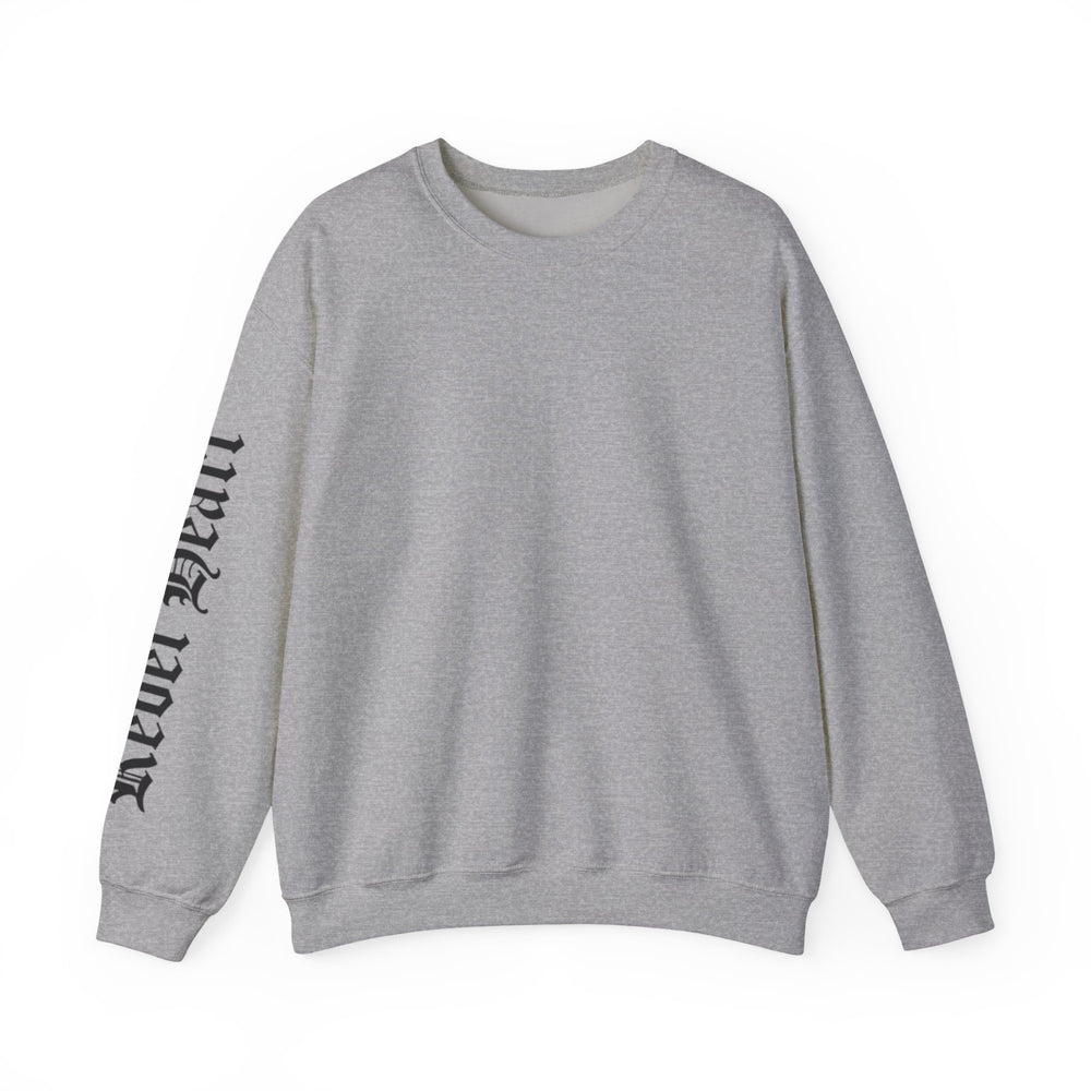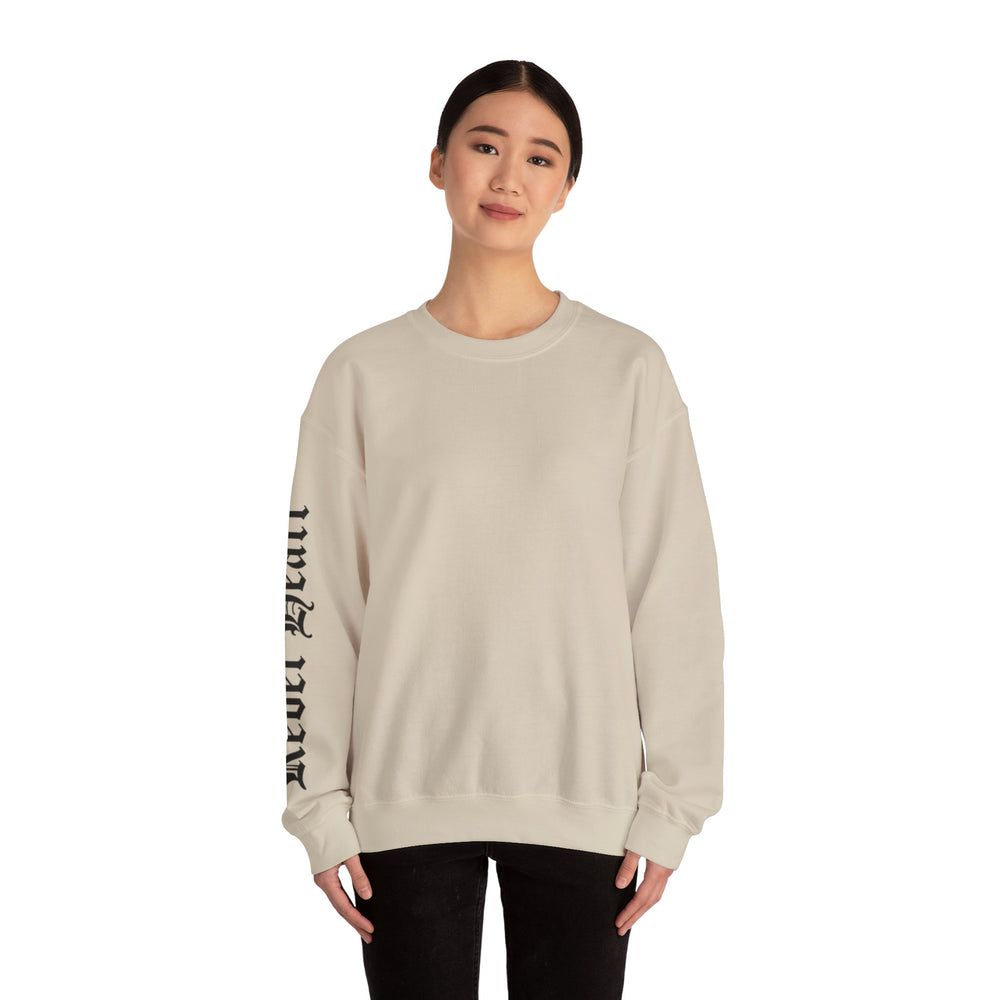 A clean, cozy crewneck that wears like a lived-in favorite. Midweight cotton-poly fabric holds its shape while offering just enough warmth for cool mornings and late nights. The white canvas keeps the look minimal; black gothic-style sleeve lettering adds a bold, streetwise edge that reads like a quiet statement. Throw it on with worn jeans or layered under a jacket — it’s the kind of sweatshirt that settles into your rotation and shows character without shouting. The cut is classic and roomy, the cuffs and hem sit snugly to trap warmth, and subtle construction details keep it feeling solid after many wears.
