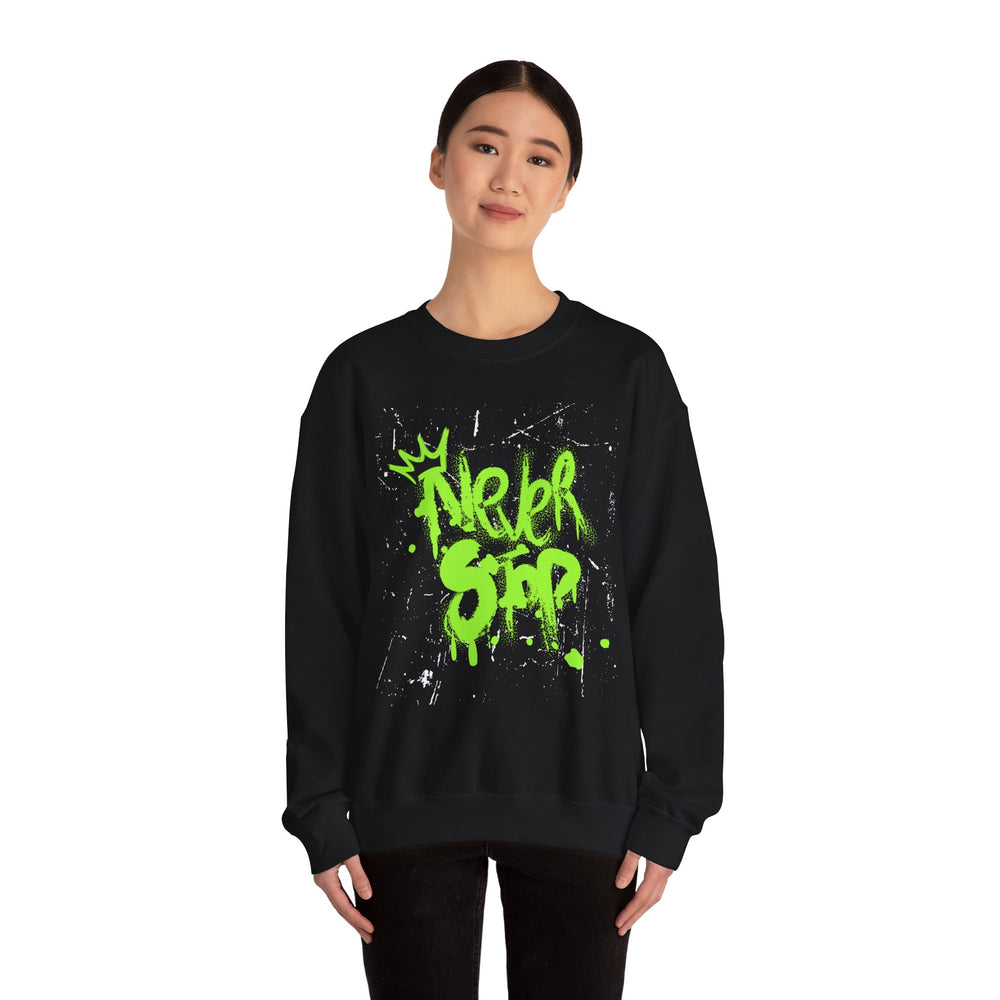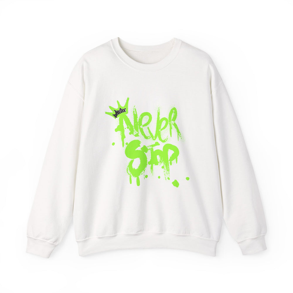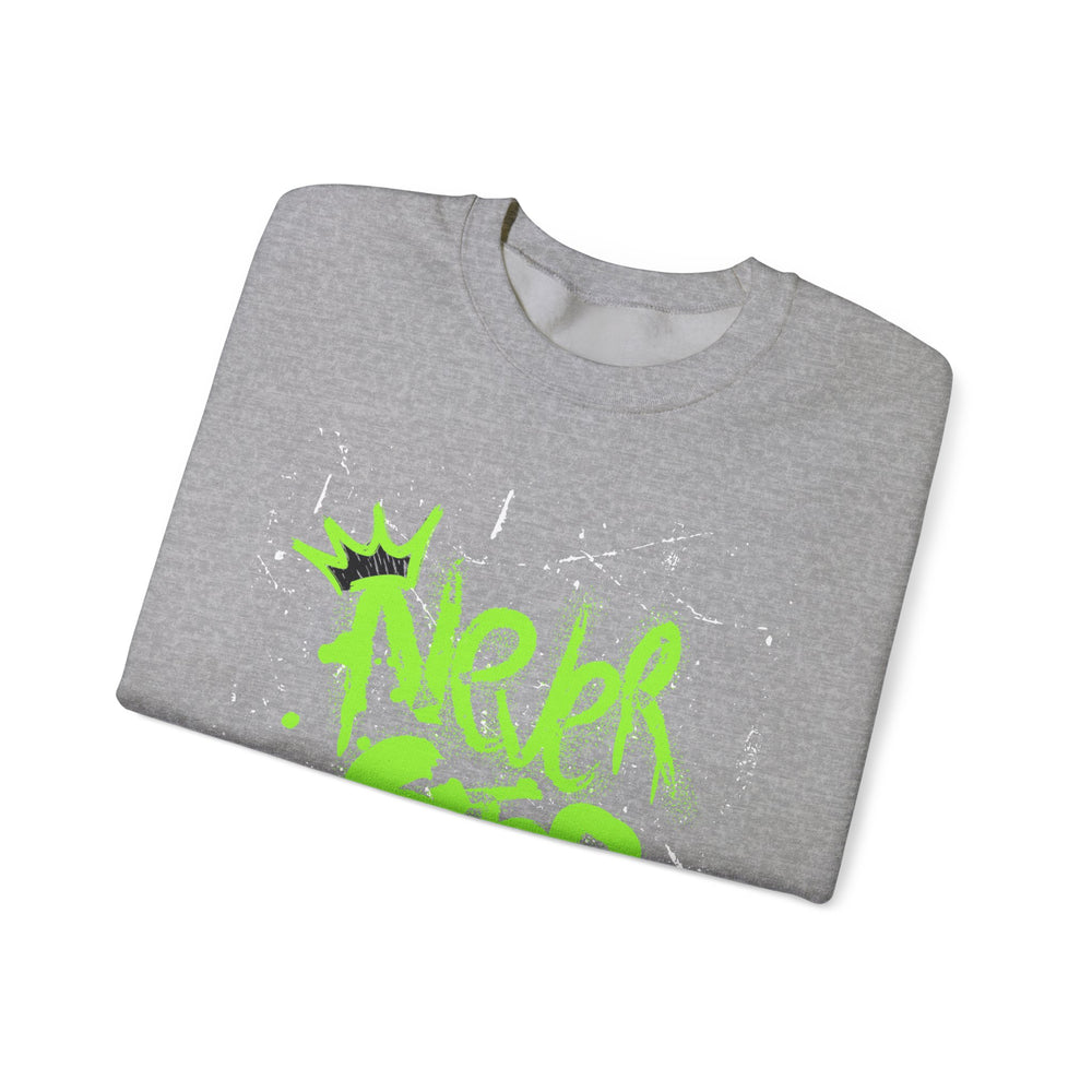 A clean, roomy crewneck with a neon attitude. This medium-weight sweatshirt feels like a warm, familiar hoodie swapped for a streetwise statement piece. The bright graffiti-style graphic splashes across the chest in vivid neon green, like a sudden pop of color on a quiet city morning. Wear it on cool walks, late-night meetups, or when you want your outfit to speak louder than words. The classic cut and soft cotton-blend make it easy to throw on and move through the day with quiet confidence.
