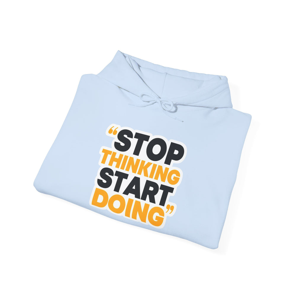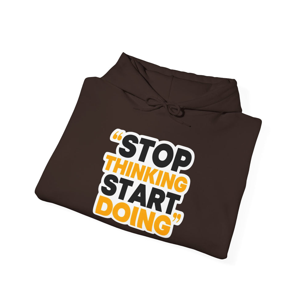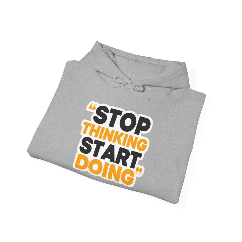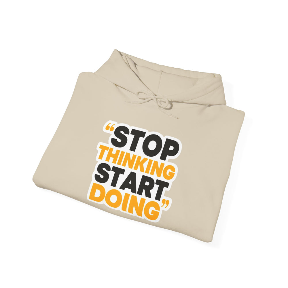 This cozy hooded sweatshirt carries a bold, motivational message—STOP THINKING START DOING—printed in strong black and warm amber tones. The clean white backdrop makes the typography pop while the double-lined hood and color-matched drawcord add everyday polish. Wear it on mornings when you need a push to get going, during late-night work sessions, or layered for weekend coffee runs. It feels substantial without being stiff, with a roomy kangaroo pocket to warm hands or hold essentials. Thoughtful details like a tear-away label and tubular knit construction keep the fit comfortable and smooth against your skin.