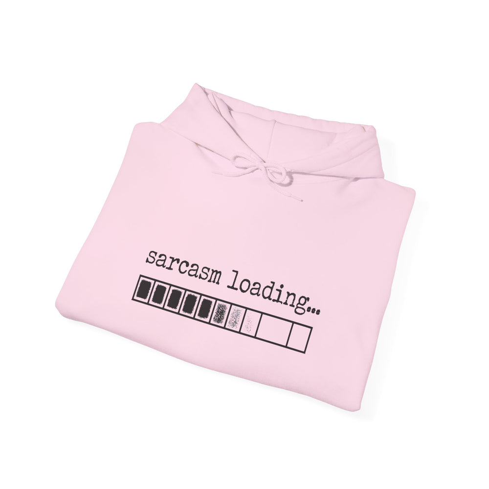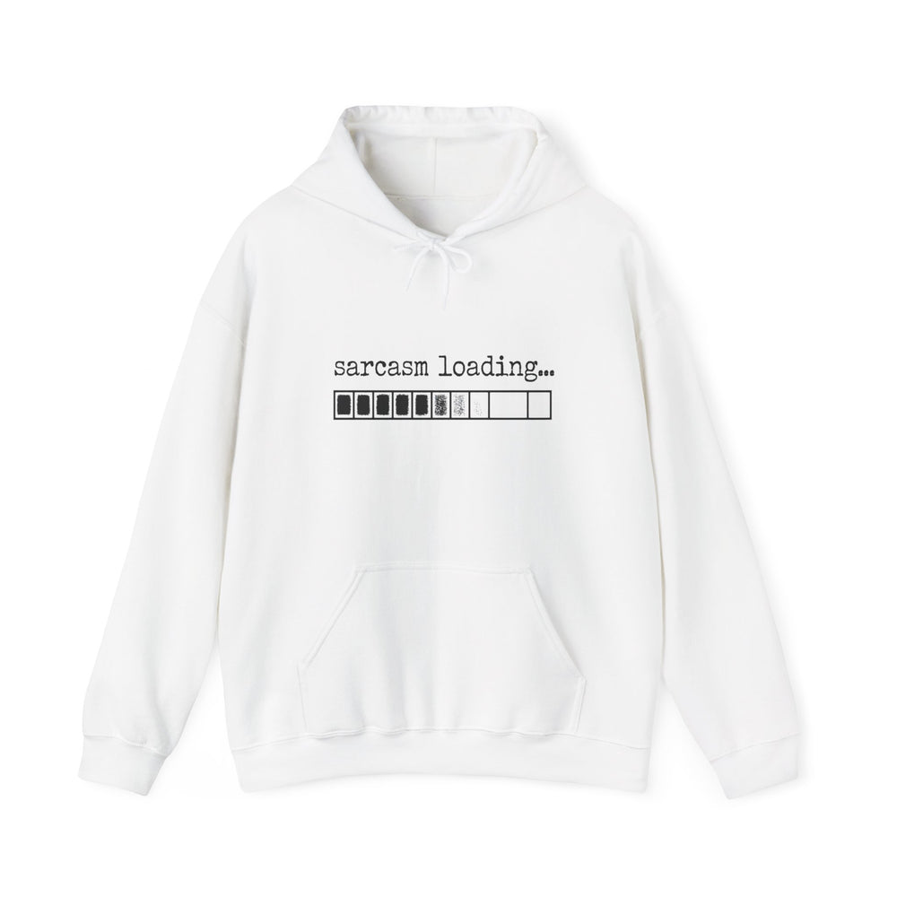 This cozy hooded sweatshirt carries a dry, clever vibe — a subtle bar-loading graphic and the text “sarcasm loading…” that reads like an inside joke. Thick, brushed fleece and a double-lined hood hug the body on cool mornings. The roomy kangaroo pocket gives your hands a warm place to hide. Wear it at home while sipping coffee, layered for evening walks, or to low-key social hangs when you want to let your sense of humor do the talking. The minimalist black-on-white design keeps the look clean and easy to pair with jeans or joggers, while the tear-away label and classic fit make it comfortable for long wear.